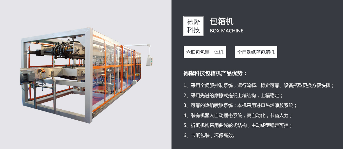 青島德隆自1995年創(chuàng)建以來(lái),始終秉承創(chuàng)新與發(fā)展的優(yōu)良傳統(tǒng),依靠技術(shù)與服務(wù)贏(yíng)得客戶(hù)的信賴(lài)與尊重。在貼標(biāo)機(jī)向?qū)W⒒?、多行業(yè)領(lǐng)域發(fā)展并成就了中國(guó)異型瓶貼標(biāo)市場(chǎng)的經(jīng)典之后,應(yīng)市場(chǎng)不斷變化的客戶(hù)需求,優(yōu)化產(chǎn)品結(jié)構(gòu),引進(jìn)吸收國(guó)內(nèi)外的流體包裝設(shè)備理念,在貼標(biāo)機(jī)專(zhuān)業(yè)化地位穩(wěn)固的前提下,逐步實(shí)現(xiàn)關(guān)聯(lián)產(chǎn)品的多元化。 目前,青島德隆已經(jīng)成為國(guó)內(nèi)能同時(shí)滿(mǎn)足圓瓶、方瓶、扁瓶、錐度瓶、球形瓶、定位瓶等瓶型的高、中、低速多功能冷(熱)膠貼標(biāo)領(lǐng)域的廠(chǎng)家。隨著碼/卸(瓶/罐)垛機(jī)、沖瓶機(jī)、灌裝擠(旋/壓)蓋機(jī)、全自動(dòng)紙箱包箱設(shè)備、排序機(jī)、機(jī)器人碼/卸垛設(shè)備、激光噴碼機(jī)的運(yùn)行成功,一個(gè)真正的流體包裝設(shè)備方案解決專(zhuān)家已經(jīng)成熟。 青島德隆集團(tuán)的···......
